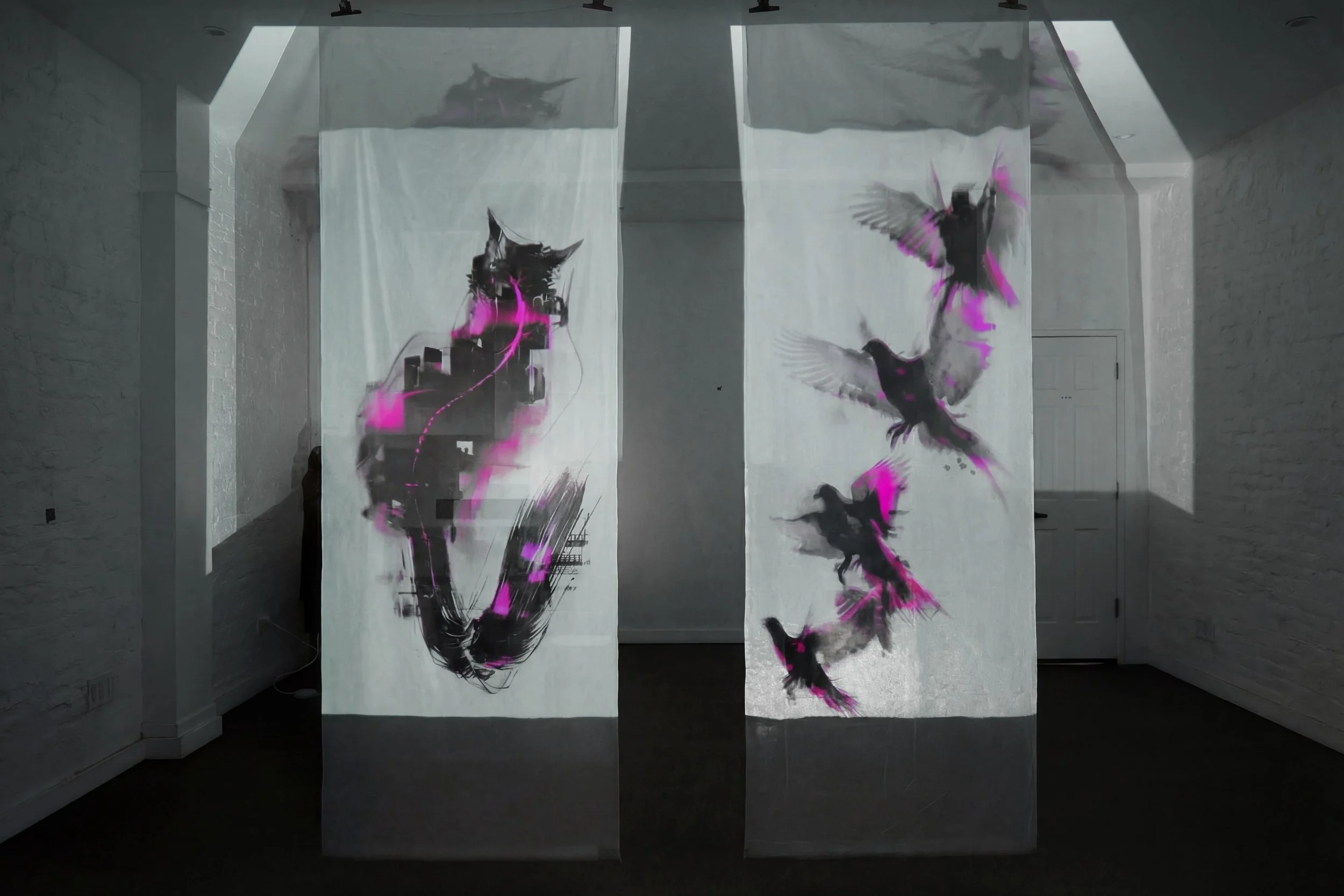 YL: I would describe it as a "Weighted Lag." When you stand inside one of my installations, you see images struggling against unstable, semi-translucent gauze; light and shadow break within the folds of frames and curtains.